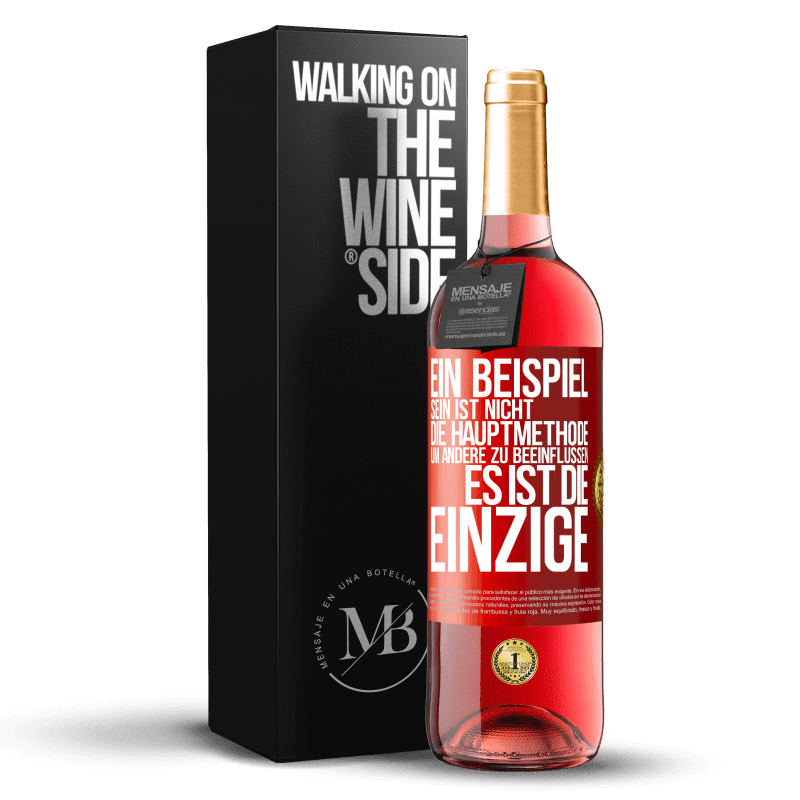 Flaschenpost. Weinflasche mit personalisiertem Etikett. Nachricht: "Ein Beispiel sein ist nicht die Hauptmethode, um andere zu beeinflussen, es ist die Einzige". Rote Markierung. Anpassbares Etikett. |