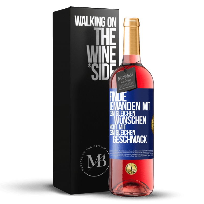 Flaschenpost. Weinflasche mit personalisiertem Etikett. Nachricht: "Finde jemanden mit dem gleichen Wünschen, nicht mit dem gleichen Geschmack". Blaue Markierung. Anpassbares Etikett. |