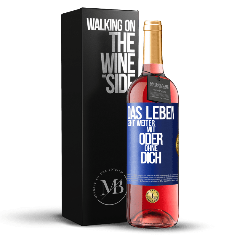 Flaschenpost. Weinflasche mit personalisiertem Etikett. Nachricht: "Das Leben geht weiter, mit oder ohne dich". Blaue Markierung. Anpassbares Etikett. |
