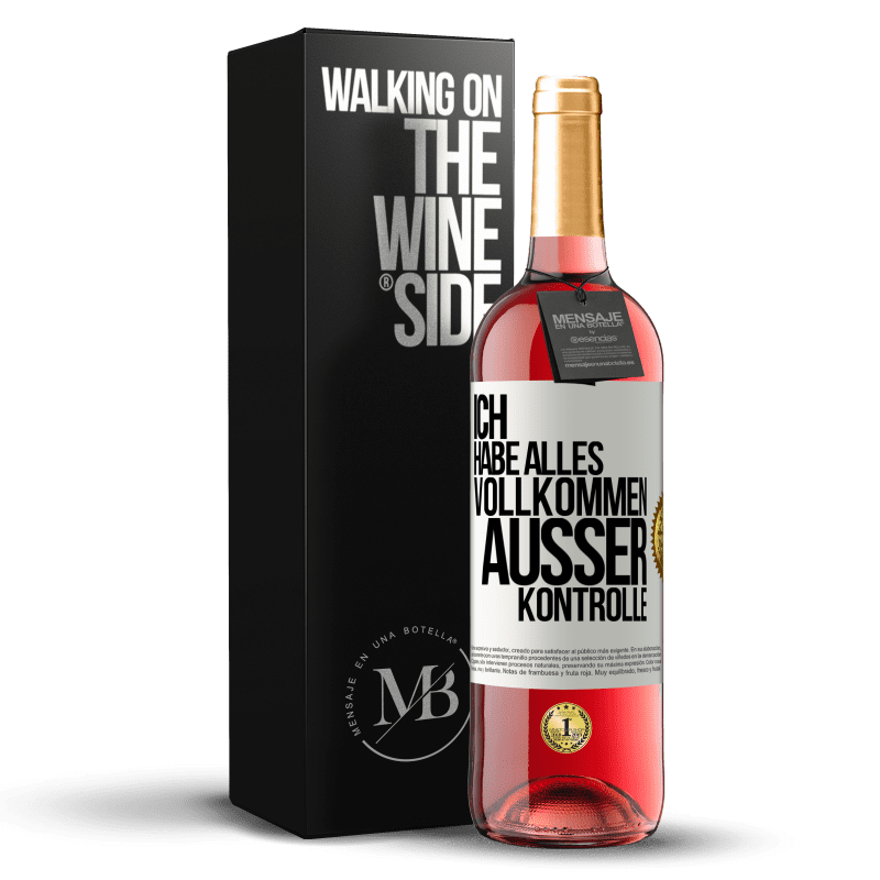 Flaschenpost. Weinflasche mit personalisiertem Etikett. Nachricht: "Ich habe alles vollkommen außer Kontrolle". Weißes Etikett. Anpassbares Etikett. |