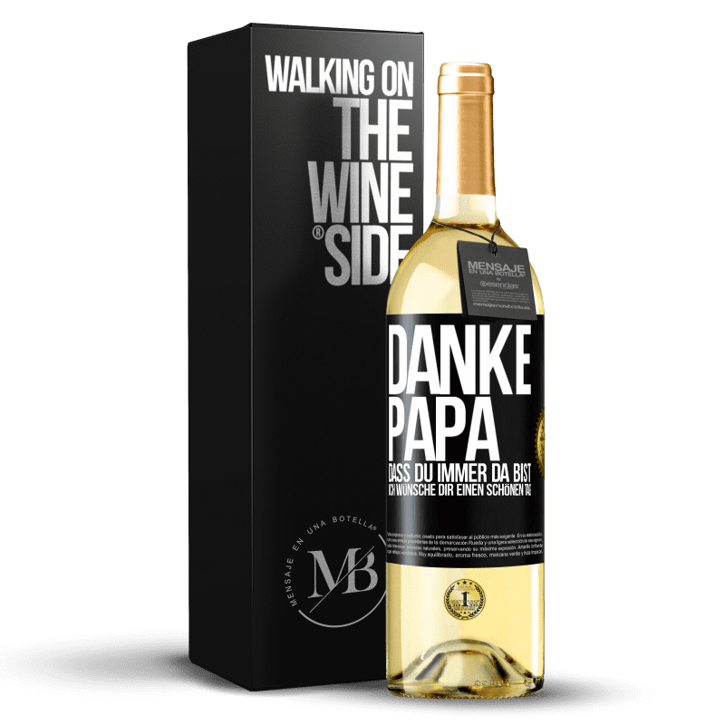 Flaschenpost. Weinflasche mit personalisiertem Etikett. Nachricht: "Danke, Papa, dass du immer da bist. Ich wünsche dir einen schönen Tag". Schwarzes Etikett. Anpassbares Etikett. |
