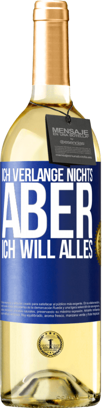 Flaschenpost. Weinflasche mit personalisiertem Etikett. Nachricht: "Ich verlange nichts, aber ich will alles". Blaue Markierung. Anpassbares Etikett. |