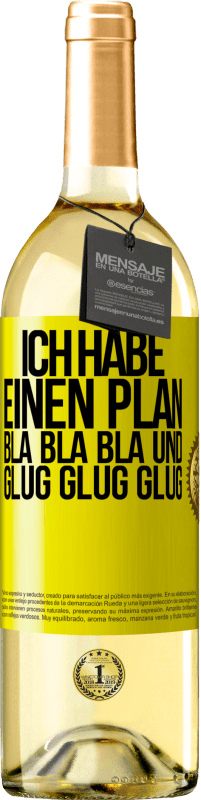 Flaschenpost. Weinflasche mit personalisiertem Etikett. Nachricht: "Ich habe einen plan: Bla Bla Bla und Glug Glug Glug". Gelbes Etikett. Anpassbares Etikett. |