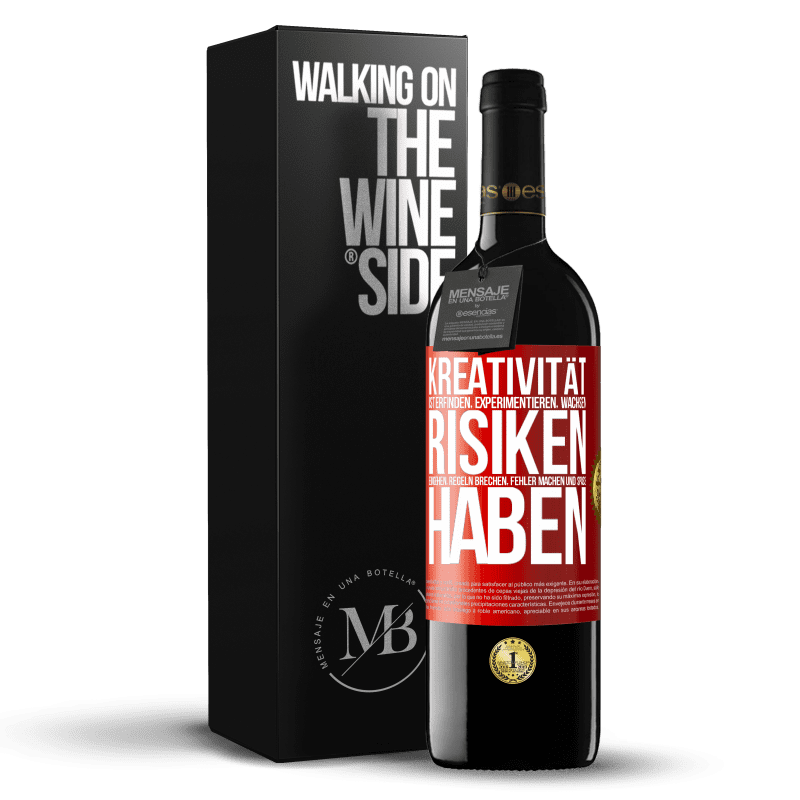 | Name | Flaschenpost. Weinflasche mit personalisiertem Etikett. Nachricht: "Kreativität ist erfinden, experimentieren, wachsen, Risiken eingehen, Regeln brechen, Fehler machen und Spaß haben". Rote Markierung. Anpassbares Etikett. |