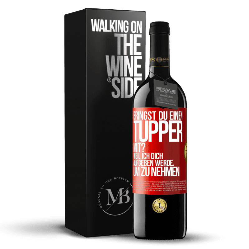 Flaschenpost. Weinflasche mit personalisiertem Etikett. Nachricht: "Bringst du einen Tupper mit? Weil ich dich aufgeben werde, um zu nehmen". Rote Markierung. Anpassbares Etikett. |