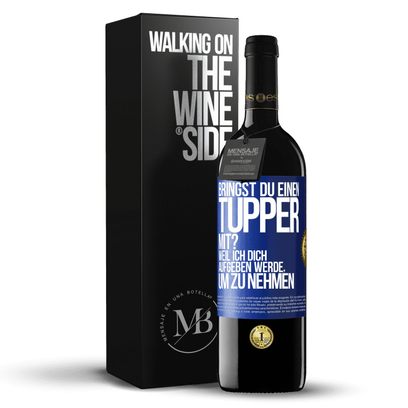 Flaschenpost. Weinflasche mit personalisiertem Etikett. Nachricht: "Bringst du einen Tupper mit? Weil ich dich aufgeben werde, um zu nehmen". Blaue Markierung. Anpassbares Etikett. |