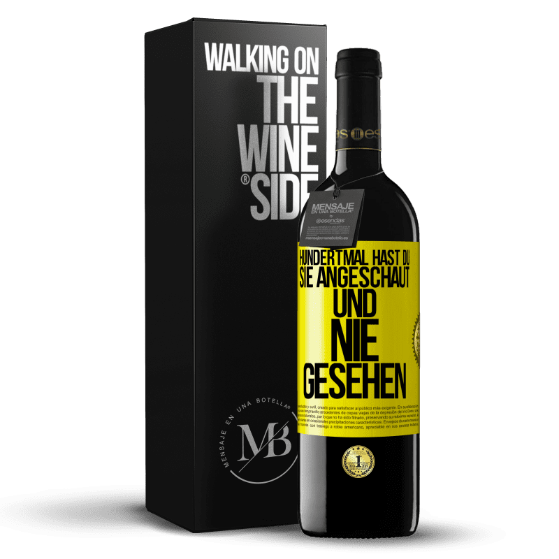 Flaschenpost. Weinflasche mit personalisiertem Etikett. Nachricht: "Hundertmal hast du sie angeschaut und nie gesehen". Gelbes Etikett. Anpassbares Etikett. |