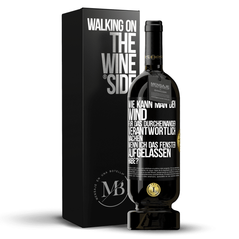 Flaschenpost. Weinflasche mit personalisiertem Etikett. Nachricht: "Wie kann man den Wind für das Durcheinander verantwortlich machen, wenn ich das Fenster aufgelassen habe?". Schwarzes Etikett. Anpassbares Etikett. |