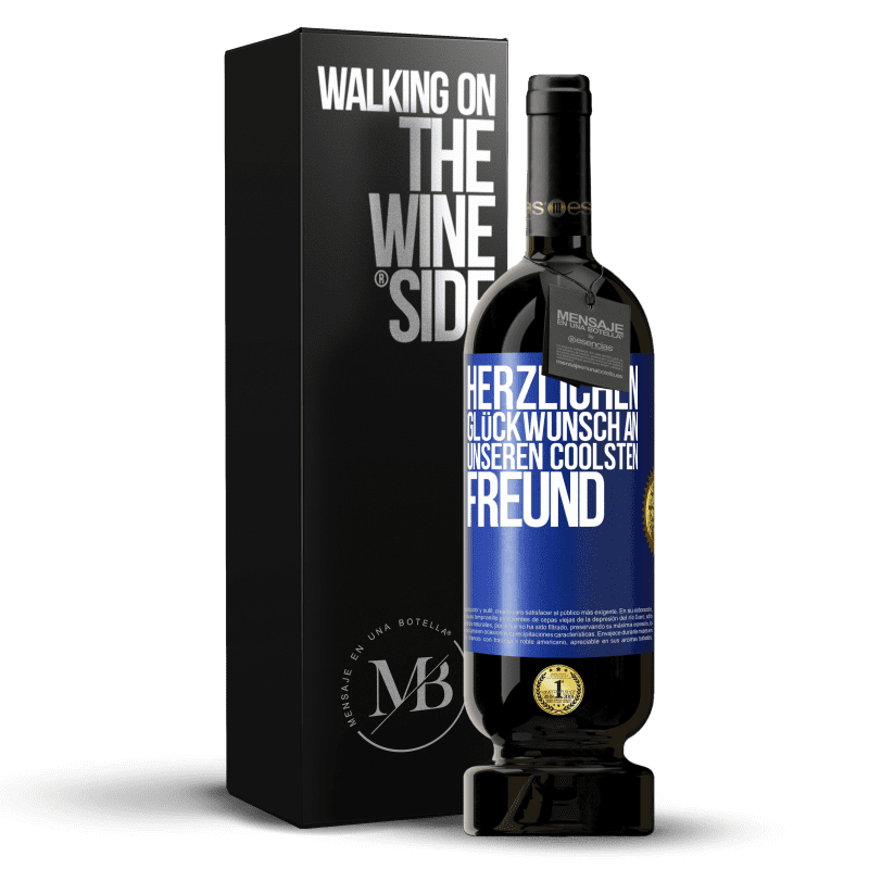 Flaschenpost. Weinflasche mit personalisiertem Etikett. Nachricht: "Herzlichen Glückwunsch an unseren coolsten Freund". Blaue Markierung. Anpassbares Etikett. |