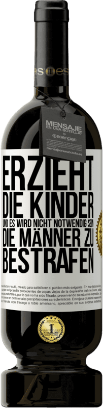 Flaschenpost. Weinflasche mit personalisiertem Etikett. Nachricht: "Erzieht die Kinder, und es wird nicht notwendig sein, die Männer zu bestrafen". Weißes Etikett. Anpassbares Etikett. |