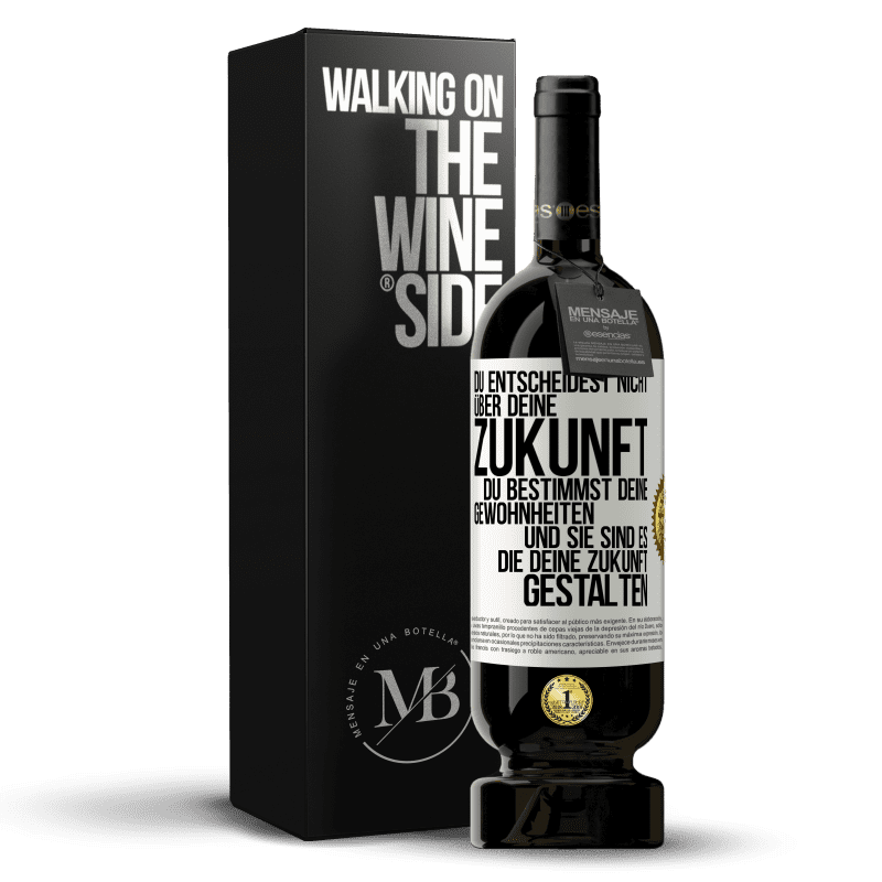 Flaschenpost. Weinflasche mit personalisiertem Etikett. Nachricht: "Du entscheidest nicht über deine Zukunft. Du bestimmst deine Gewohnheiten und sie sind es, die deine Zukunft gestalten". Weißes Etikett. Anpassbares Etikett. |