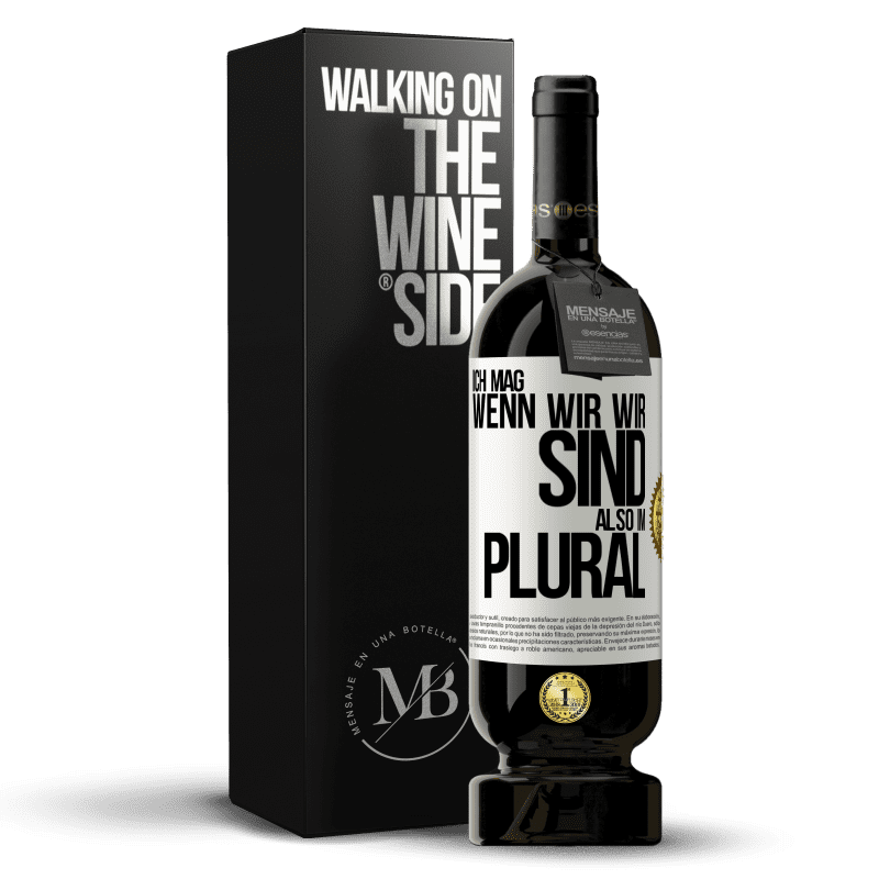 Flaschenpost. Weinflasche mit personalisiertem Etikett. Nachricht: "Ich mag, wenn wir wir sind. Also im Plural". Weißes Etikett. Anpassbares Etikett. |