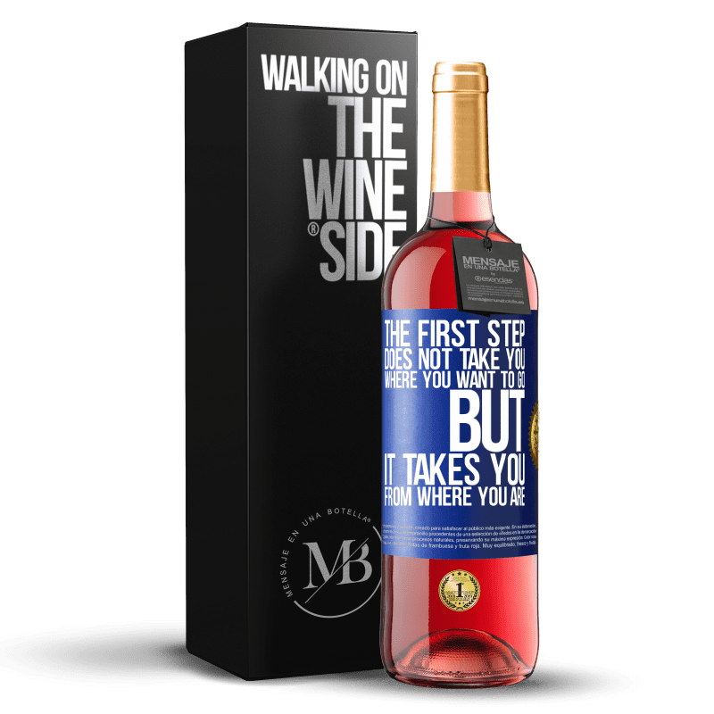 Message in a Bottle. Wine bottle with customized label. Message: "The first step does not take you where you want to go, but it takes you from where you are". Blue Label. Customizable label. |