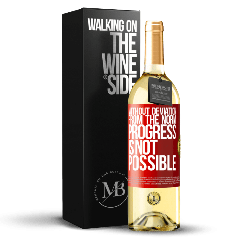 Message in a Bottle. Wine bottle with customized label. Message: "Without deviation from the norm, progress is not possible". Red Label. Customizable label. |