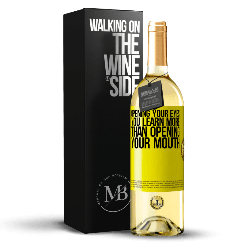 Message in a Bottle. Wine bottle with customized label. Message: "Opening your eyes you learn more than opening your mouth". Yellow Label. Customizable label. |