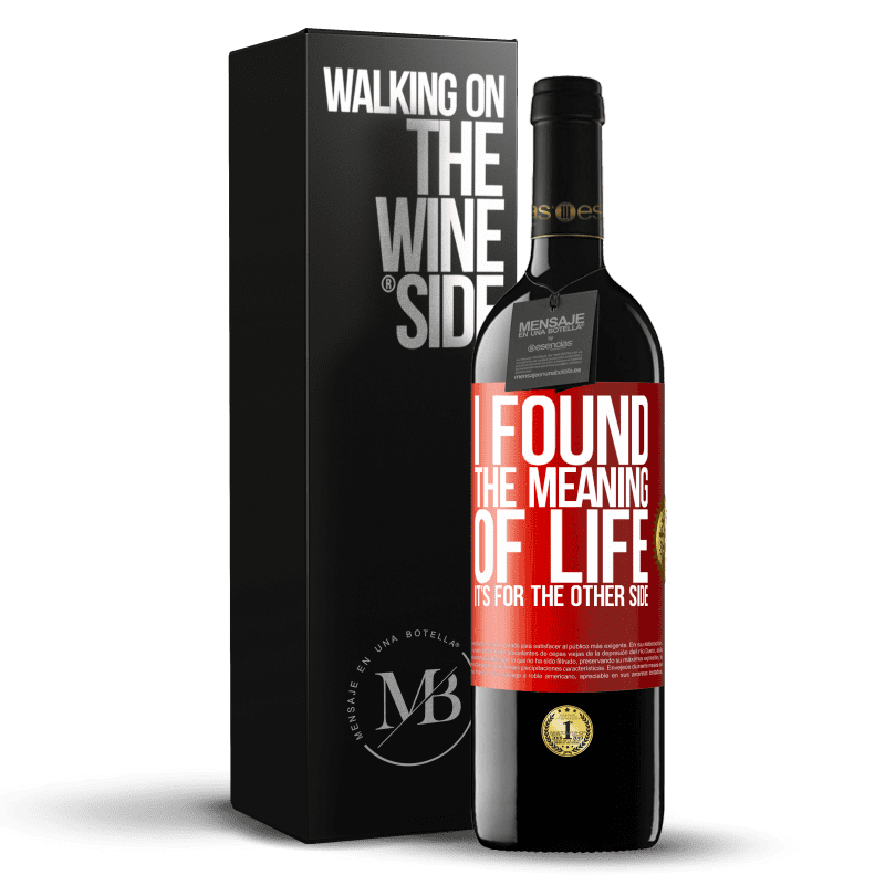 Message in a Bottle. Wine bottle with customized label. Message: "I found the meaning of life. It's for the other side". Red Label. Customizable label. |