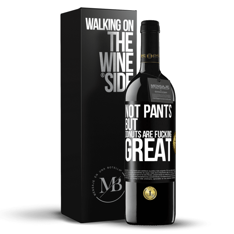 Message in a Bottle. Wine bottle with customized label. Message: "Not pants, but donuts are fucking great". Black Label. Customizable label. |