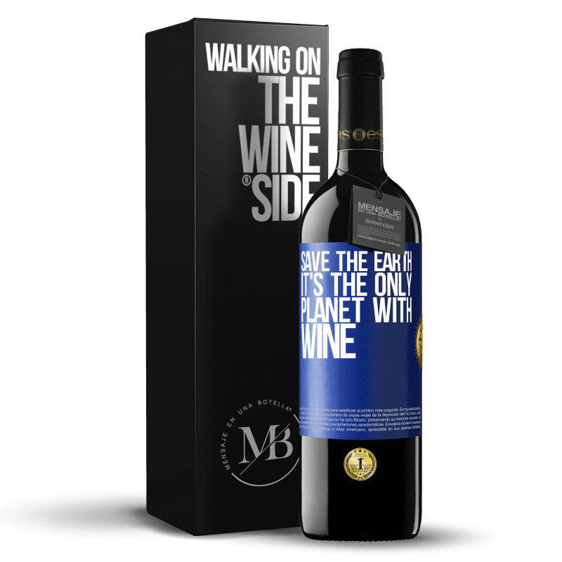 Message in a Bottle. Wine bottle with customized label. Message: "Save the earth. It's the only planet with wine". Blue Label. Customizable label. |