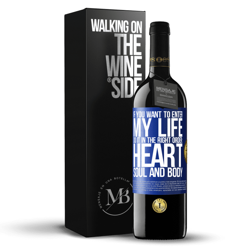 Message in a Bottle. Wine bottle with customized label. Message: "If you want to enter my life, do it in the right order: heart, soul and body". Blue Label. Customizable label. |