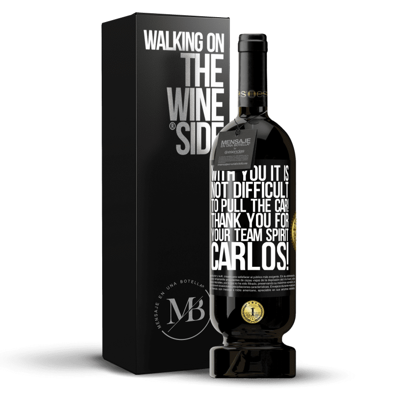 Message in a Bottle. Wine bottle with customized label. Message: "With you it is not difficult to pull the car! Thank you for your team spirit Carlos!". Black Label. Customizable label. |