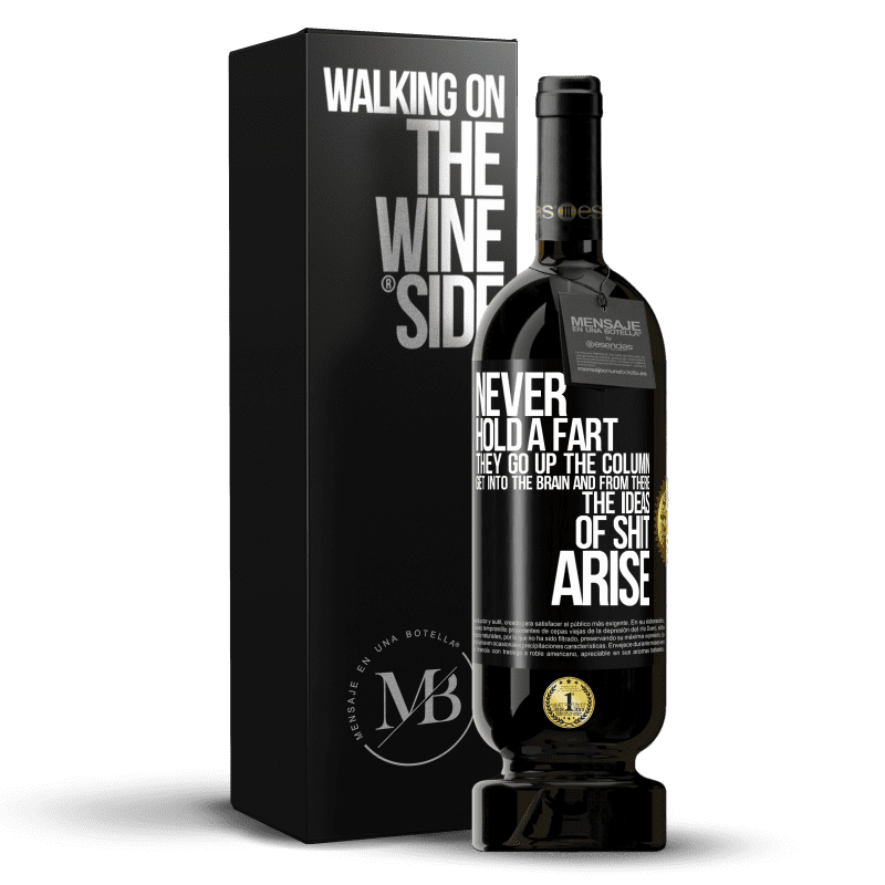 Message in a Bottle. Wine bottle with customized label. Message: "Never hold a fart. They go up the column, get into the brain and from there the ideas of shit arise". Black Label. Customizable label. |