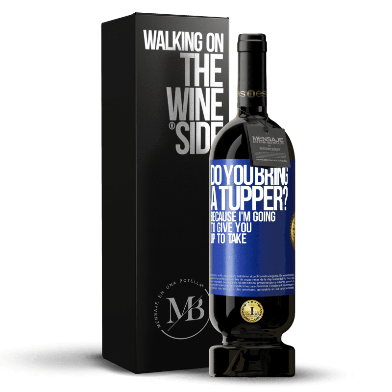 Message in a Bottle. Wine bottle with customized label. Message: "Do you bring a tupper? Because I'm going to give you up to take". Blue Label. Customizable label. |