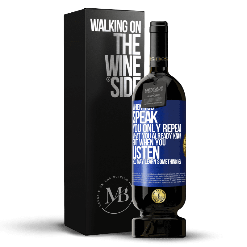 Message in a Bottle. Wine bottle with customized label. Message: "When you speak, you only repeat what you already know, but when you listen, you may learn something new". Blue Label. Customizable label. |
