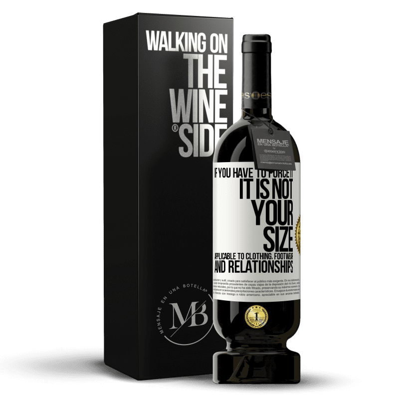 Message in a Bottle. Wine bottle with customized label. Message: "If you have to force it, it is not your size. Applicable to clothing, footwear and relationships". White Label. Customizable label. |