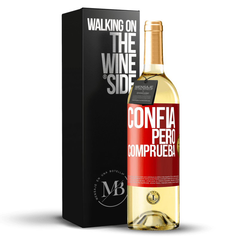 | Nombre | Mensaje en una Botella. Botella de vino con etiqueta personalizada. Mensaje: "Confía, pero comprueba". Etiqueta Roja. Etiqueta personalizable. |