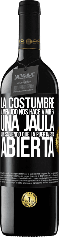 Mensaje en una Botella. Botella de vino con etiqueta personalizada. Mensaje: "La costumbre a menudo nos hace vivir en una jaula aún sabiendo que la puerta está abierta". Etiqueta Negra. Etiqueta personalizable. |