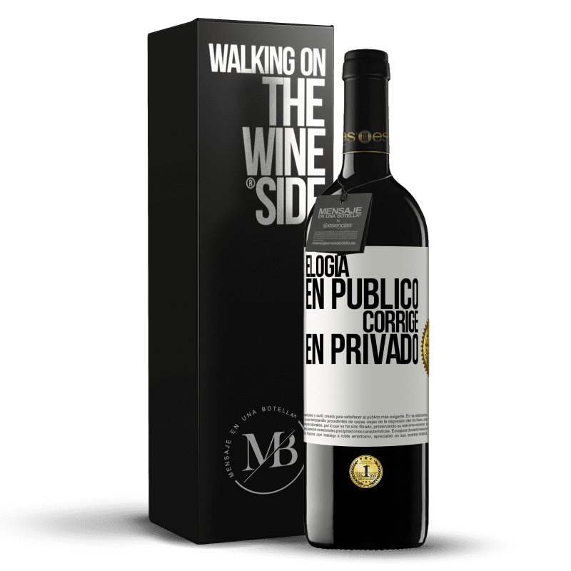 Mensaje en una Botella. Botella de vino con etiqueta personalizada. Mensaje: "Elogia en público, corrige en privado". Etiqueta Blanca. Etiqueta personalizable. |