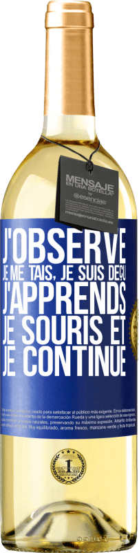 Message dans une Bouteille. Bouteille de vin avec étiquette personnalisée. Message: "J'observe, je me tais, je suis déçu, j'apprends, je souris et je continue". Étiquette Bleue. Étiquette personnalisable. |