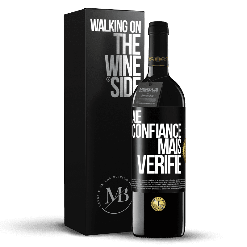 Message dans une Bouteille. Bouteille de vin avec étiquette personnalisée. Message: "Aie confiance, mais vérifie ". Étiquette Noire. Étiquette personnalisable. |