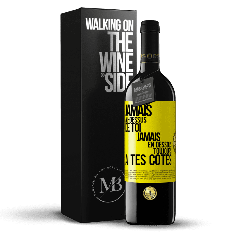 Message dans une Bouteille. Bouteille de vin avec étiquette personnalisée. Message: "Jamais au-dessus de toi, jamais en dessous. Toujours à tes côtés". Étiquette Jaune. Étiquette personnalisable. |