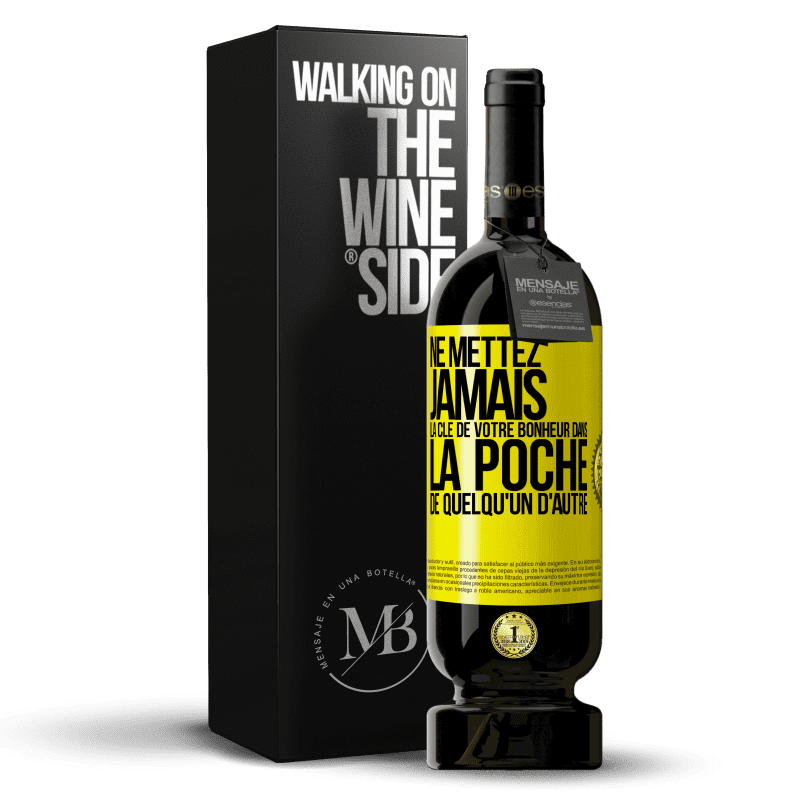 Message dans une Bouteille. Bouteille de vin avec étiquette personnalisée. Message: "Ne mettez jamais la clé de votre bonheur dans la poche de quelqu'un d'autre". Étiquette Jaune. Étiquette personnalisable. |