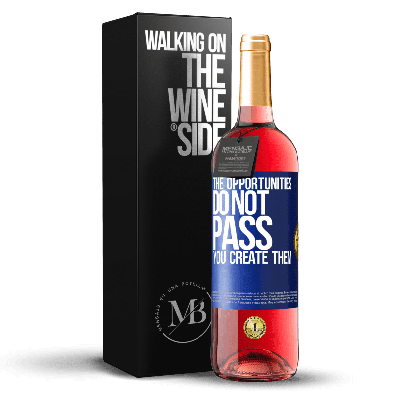 ボトル内のメッセージ. パーソナライズされたラベル付きのワインボトル. メッセージ: "機会は過ぎません。それらを作成します". 青いタグ. カスタマイズ可能なラベル. |