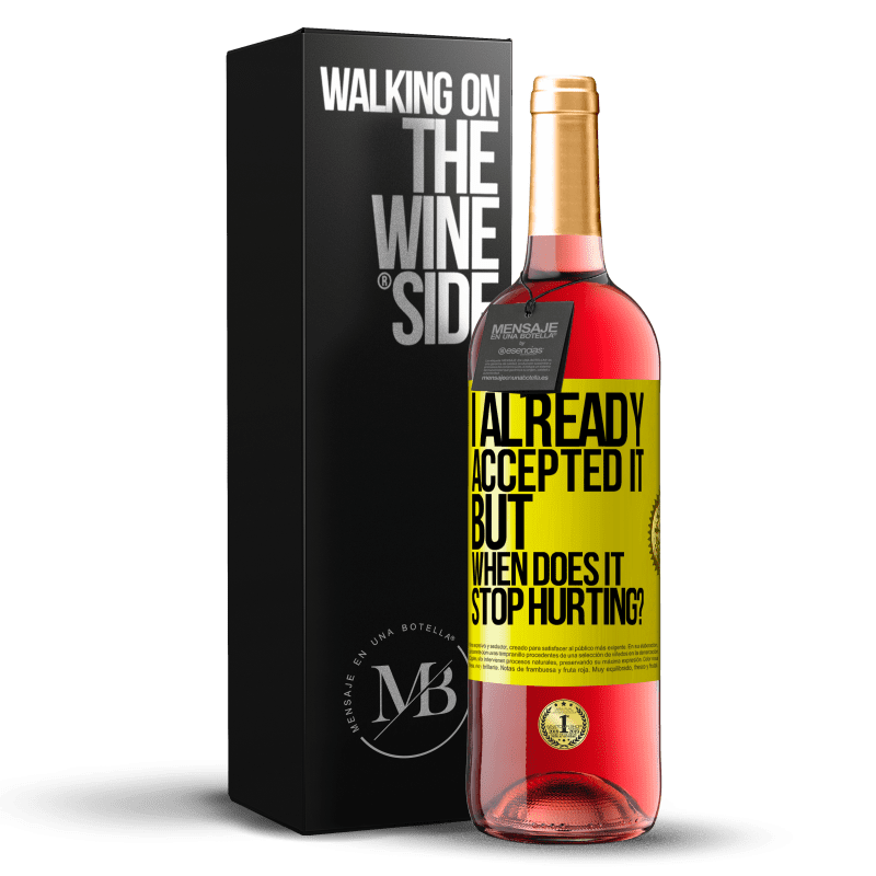 ボトル内のメッセージ. パーソナライズされたラベル付きのワインボトル. メッセージ: "私はすでにそれを受け入れました、しかしそれはいつ傷つくのをやめますか?". 黄色のラベル. カスタマイズ可能なラベル. |