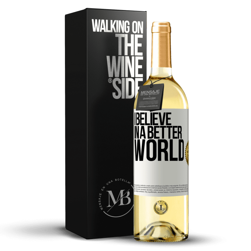 ボトル内のメッセージ. パーソナライズされたラベル付きのワインボトル. メッセージ: "私は(IN)より良い世界を信じています". ホワイトラベル. カスタマイズ可能なラベル. |