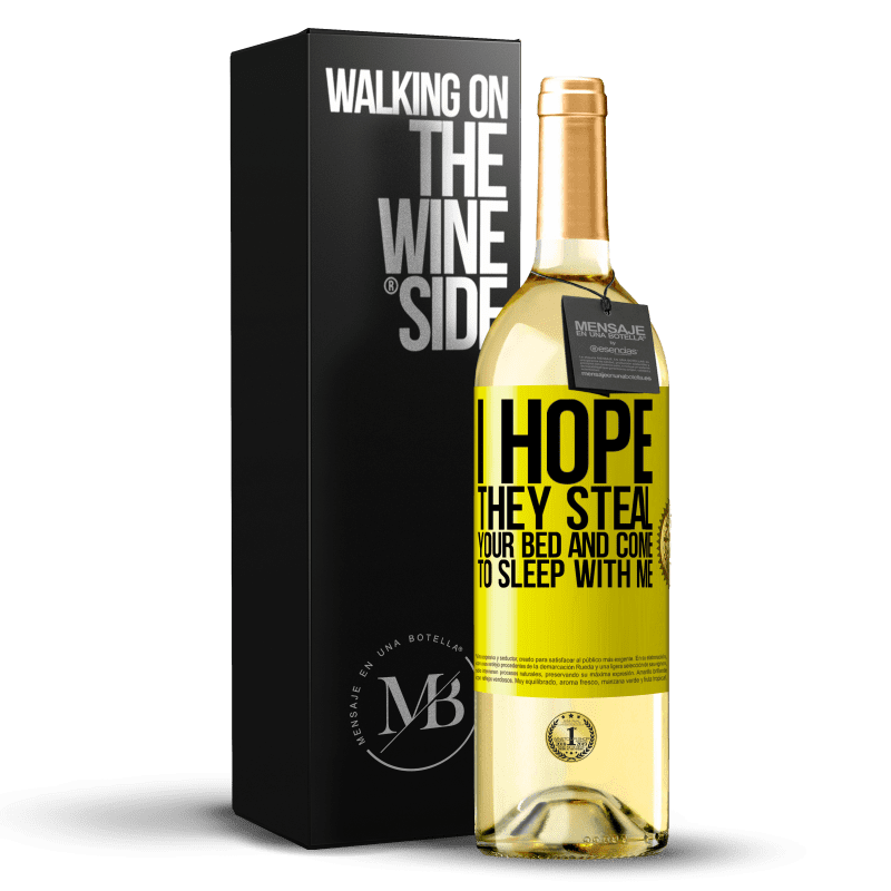 ボトル内のメッセージ. パーソナライズされたラベル付きのワインボトル. メッセージ: "彼らがあなたのベッドを盗み、私と一緒に寝ることを願っています". 黄色のラベル. カスタマイズ可能なラベル. |
