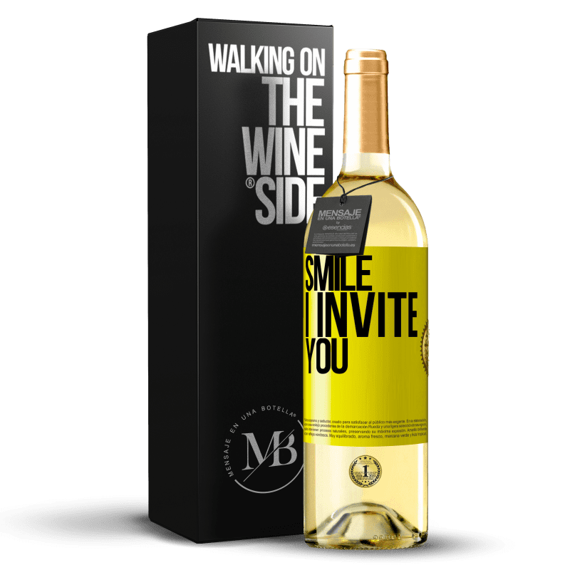 ボトル内のメッセージ. パーソナライズされたラベル付きのワインボトル. メッセージ: "笑顔、私は招待します". 黄色のラベル. カスタマイズ可能なラベル. |