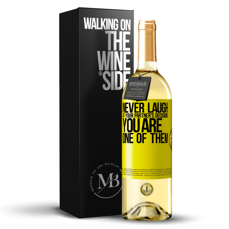 ボトル内のメッセージ. パーソナライズされたラベル付きのワインボトル. メッセージ: "パートナーの決定を決して笑わないでください。あなたは彼らの一人です". 黄色のラベル. カスタマイズ可能なラベル. |