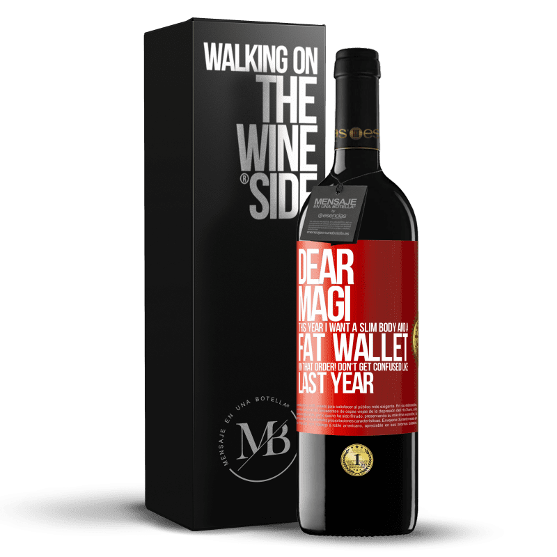 ボトル内のメッセージ. パーソナライズされたラベル付きのワインボトル. メッセージ: "親愛なるマギ、今年はスリムなボディと太い財布が欲しい。その順序で!昨年のように混乱しないでください". 赤いタグ. カスタマイズ可能なラベル. |