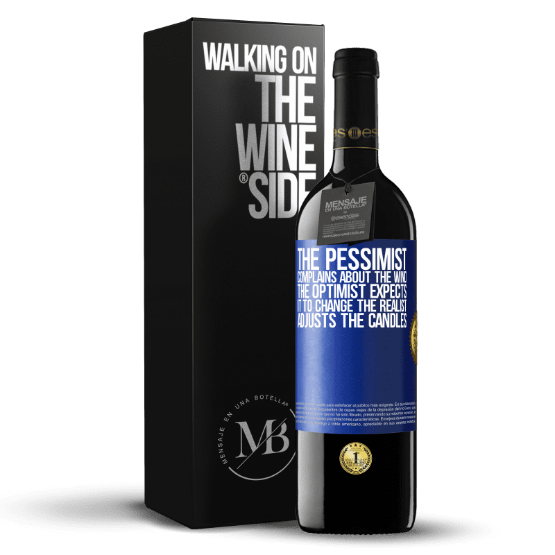 ボトル内のメッセージ. パーソナライズされたラベル付きのワインボトル. メッセージ: "悲観主義者は風を訴えます。楽観主義者は、それが変わることを期待しています。現実主義者はろうそくを調整します". 青いタグ. カスタマイズ可能なラベル. |