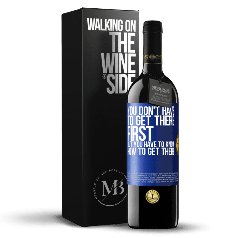 ボトル内のメッセージ. パーソナライズされたラベル付きのワインボトル. メッセージ: "最初にそこに着く必要はありませんが、そこに着く方法を知っている必要があります". 青いタグ. カスタマイズ可能なラベル. |