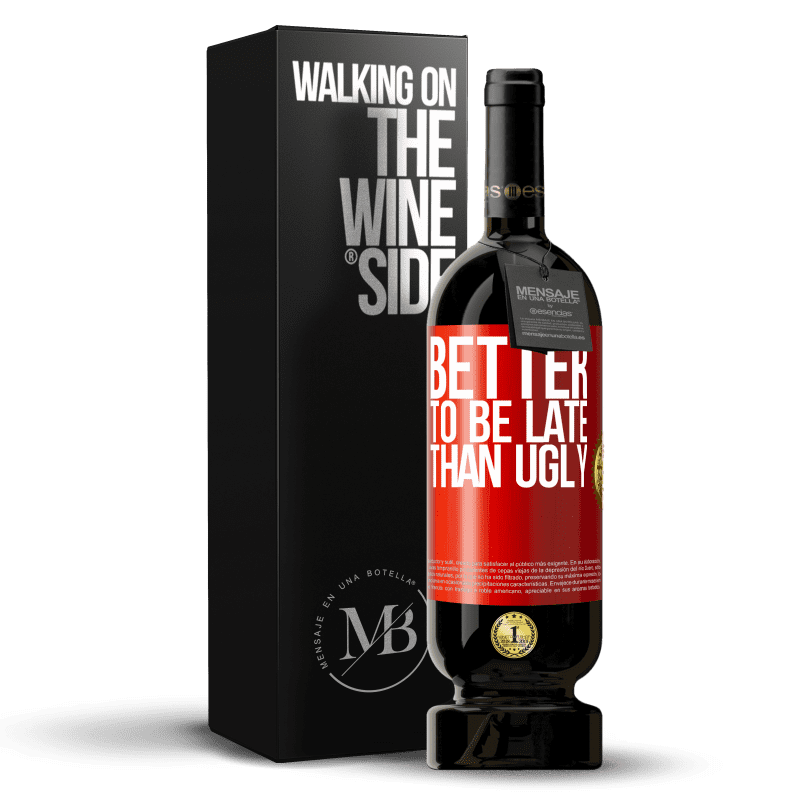 ボトル内のメッセージ. パーソナライズされたラベル付きのワインボトル. メッセージ: "Ugいより遅れる方が良い". 赤いタグ. カスタマイズ可能なラベル. |
