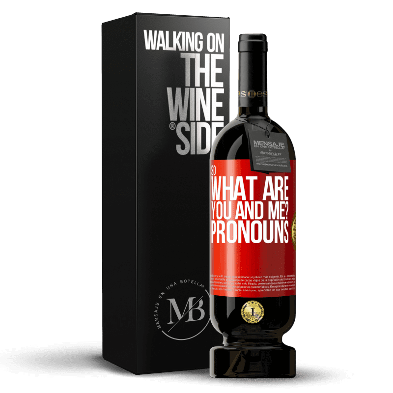 ボトル内のメッセージ. パーソナライズされたラベル付きのワインボトル. メッセージ: "それで、あなたと私は何ですか?代名詞". 赤いタグ. カスタマイズ可能なラベル. |