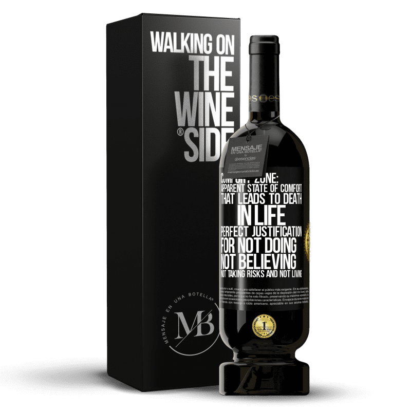 ボトル内のメッセージ. パーソナライズされたラベル付きのワインボトル. メッセージ: "快適ゾーン:生命の死につながる快適な見かけの状態。しない、信じない、リスクを負わない、生きていないという完璧な正当化". ブラックラベル. カスタマイズ可能なラベル. |