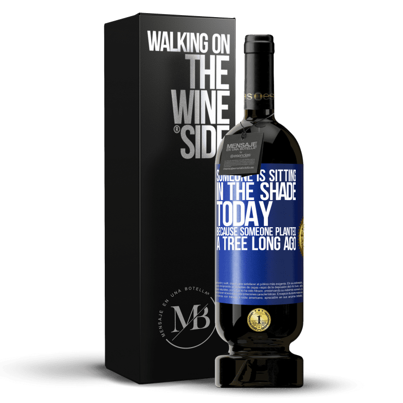 ボトル内のメッセージ. パーソナライズされたラベル付きのワインボトル. メッセージ: "誰かがずっと前に木を植えたので、誰かが今日日陰に座っています". 青いタグ. カスタマイズ可能なラベル. |