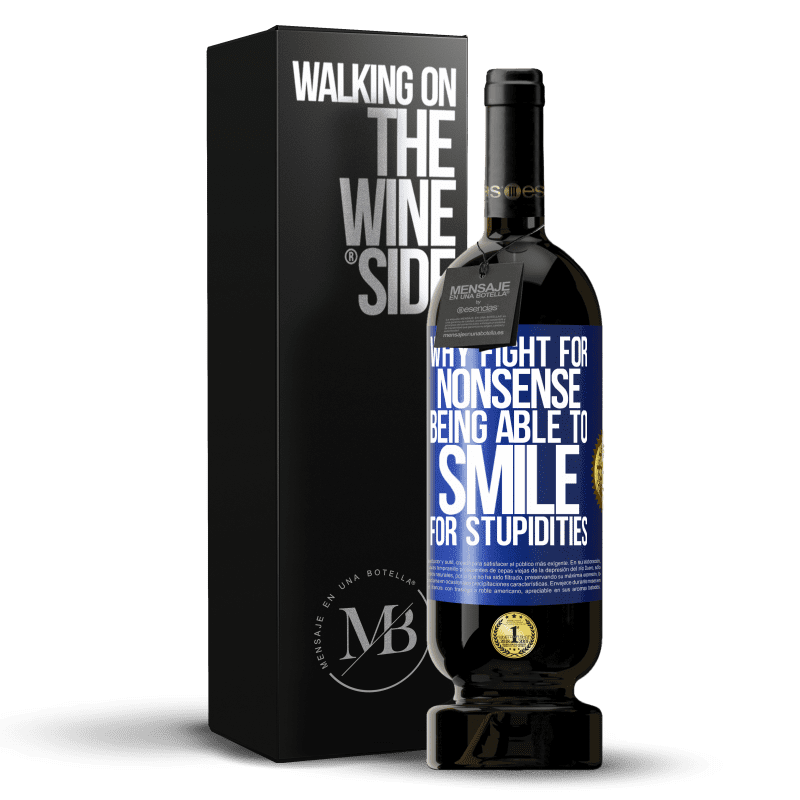 ボトル内のメッセージ. パーソナライズされたラベル付きのワインボトル. メッセージ: "愚かさのために微笑むことができるナンセンスのために戦う理由". 青いタグ. カスタマイズ可能なラベル. |
