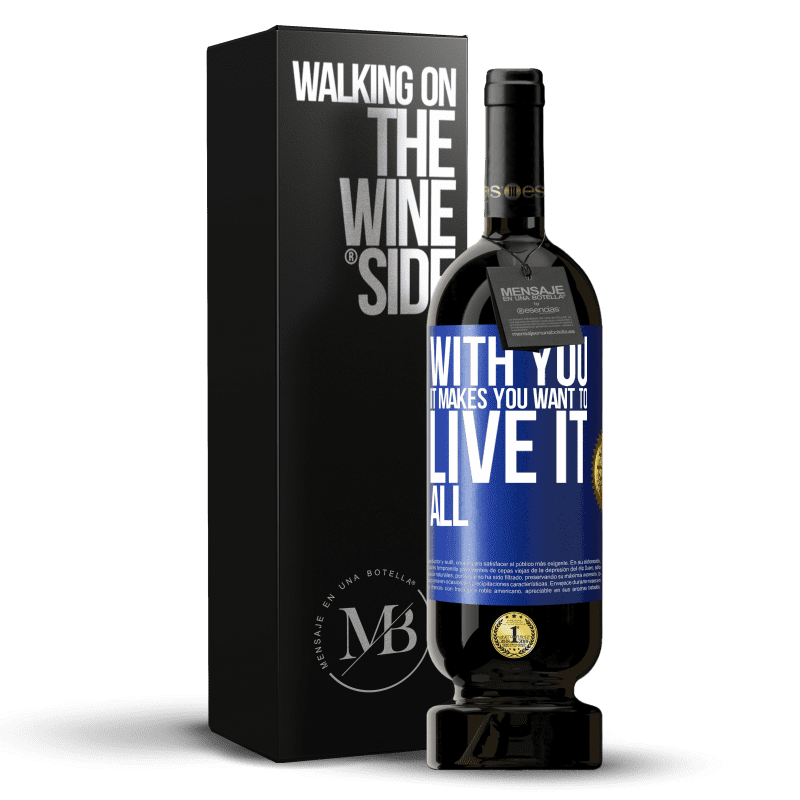 ボトル内のメッセージ. パーソナライズされたラベル付きのワインボトル. メッセージ: "あなたと一緒にそれはあなたがそれをすべて生きたいと思うようにします". 青いタグ. カスタマイズ可能なラベル. |